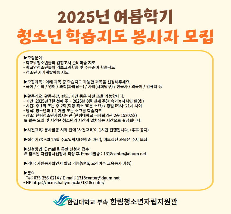 2025년 여름학기 동안 청소년들의 학습을 도와줄 멘토봉사자를 모집합니다.