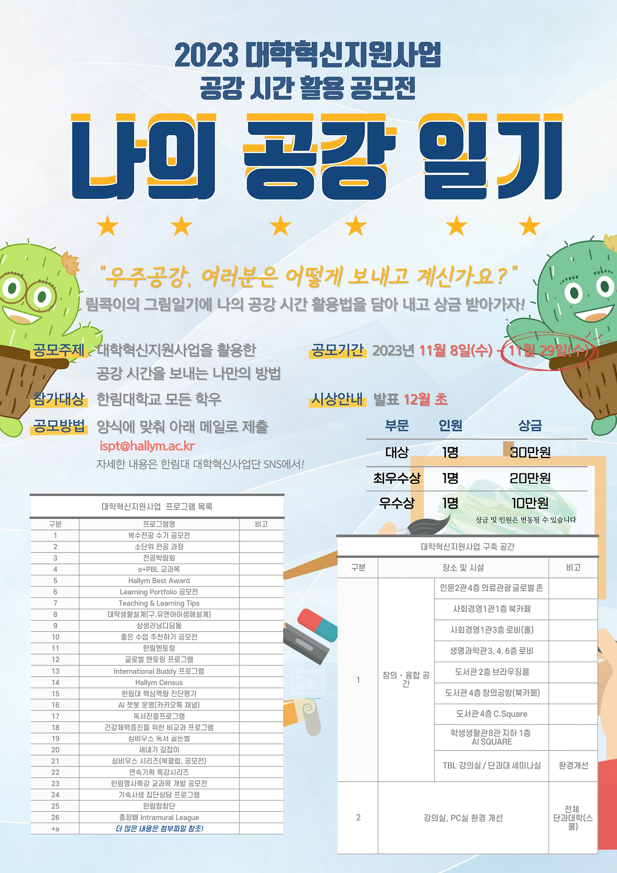 한림대학교 대학혁신사업단에서는 대학혁신지원사업과 함께하는 공강 시간 활용법을 공유해보는 「나의 공강 일기」공모전을 개최합니다.