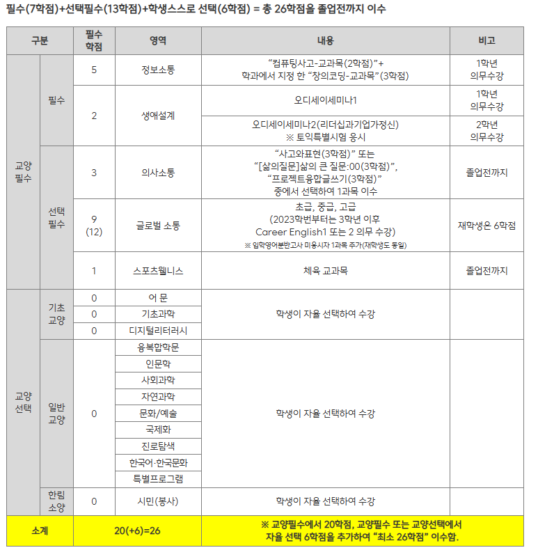 ※ 의과대학 및 글로벌융합대학은 교양필수·교양선택 이수기준은 따로 정함.(단과대학 교학팀 문의)
