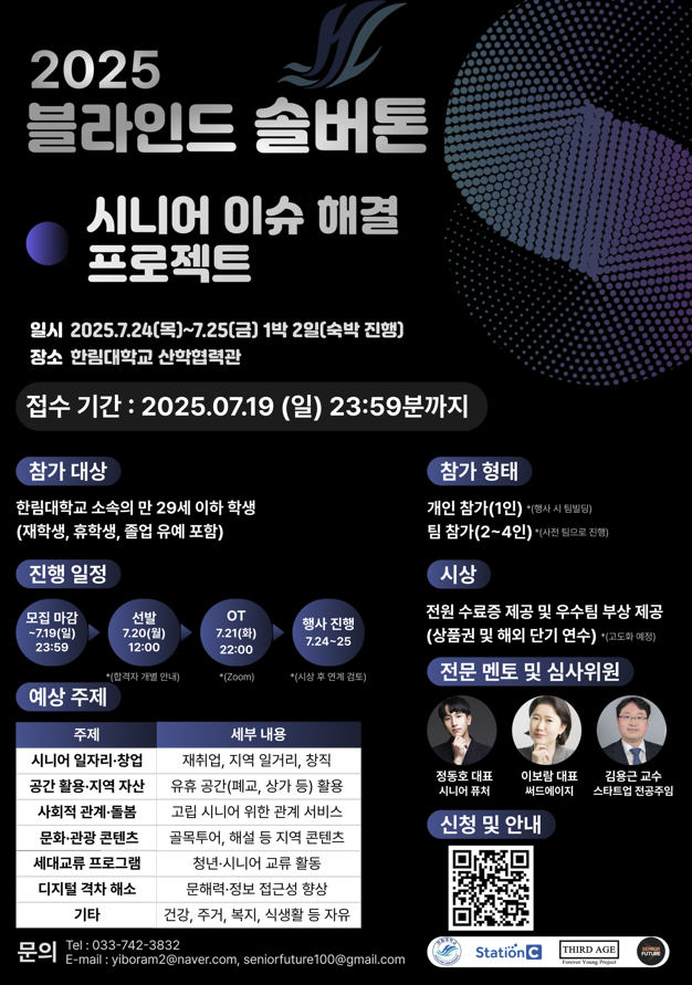 솔버톤은 춘천 지역과 시니어 이슈를 연결하는 사회문제 해결형 프로젝트로, 한림대 학생들이 직접 로컬 문제를 정의하고, 창의적 아이디어를 기획·제안하는 실전 프로그램입니다. 전문 멘토단의 멘토링, 다양한 시상 및 후속 기회도 준비되어 있으니 많은 관심과 참여 바랍니다.