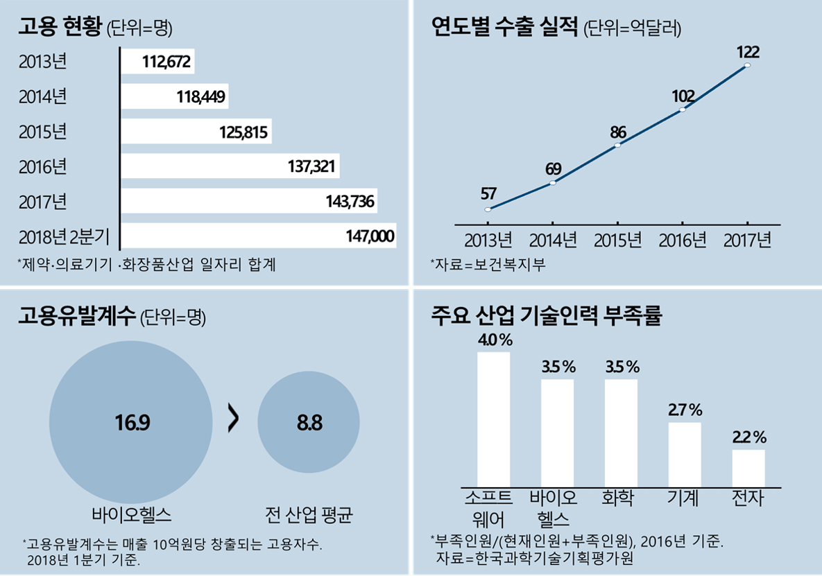 국내 바이오헬스산업 일자리: 2013년 11만3000명 → 2017년 14만4000명 (연평균 5.6% 증가)