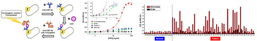 - MIN Lab.에서는 고감도의 진단검사 기술에 관련한 연구도 수행하고 있습니다. 이를 위해서 앞서 말씀드린 표면발현 기술을 면역검사에 적용하고 있습니다. 면역검사는 가장 널리 사용되고 있는 진단검사의 일종으로 항원-항체 반응을 활용하여 원하고자 하는 항원 또는 항체를 정량검사하는 방법입니다. 분자인식을 위해 가장 널리 사용되고 있는 항체는 Y자 형태의 단백질로, 2개의 항원과의 결합부위가 양쪽 가지 끝에 국소적으로 존재하고 있습니다. 이러한 구조적인 특징으로 인하여 고밀도의 항체고정화 기술이나, 항체의 배향조절 기술을 필요로 하고 있습니다. MIN Lab.에서는 배향조절을 위해 항체의 Fc부분과 결합특이성을 가지는 Z-domain을 표면발현의 타겟 단백질로 활용하여 대장균 외막에 발현하였습니다. 이러한 Z-domain은 오토디스플레이를 대장균 외막에 1.8∙105 copies/cell로 고밀도로 발현되어 있어 배향조절효과와 함께 밀도조절 효과까지 가지고 있습니다. 이 외에도 바이오틴과의 결합특이성을 가지는 streptavidin을 발현하여 진단검사에 응용하고 있습니다.